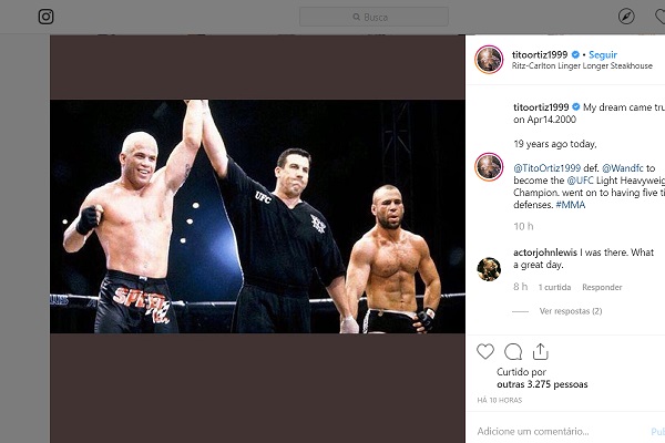 Por meio de publicação no Instagram (veja abaixo ou clique aqui), o veterano comemorou o feito. “Meu sonho se tornou realidade no dia 14 de abril de 2000. 19 anos hoje. Derrotei Wanderlei Silva para me tornar campeão meio-pesado do UFC. Em seguida, tive cinco defesas bem sucedidas de título”, escreveu Ortiz.