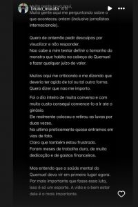 “Muita gente me perguntando sobre o que aconteceu ontem. Não cabe a mim tentar definir o tamanho do monstro que habita a cabeça do Quemuel e fazer qualquer juízo de valor. Muitos aqui me criticando e me dizendo que eu deveria ter agido de tal forma ou de outra forma. Não me importo. Foi o dia inteiro de muita conversa e, com muito custo, consegui convencê-lo a ir até o ginásio“, declarou o treinador.