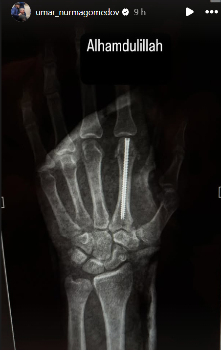 A lesão sofrida por Umar Nurmagomedov na derrota para Merab Dvalishvili no ‘co-main event’ do UFC 311, no último sábado (18), levou o russo à mesa de cirurgia. Nesta quinta-feira (23), o peso-galo (61 kg) utilizou suas redes sociais para publicar uma imagem de raio-x da sua mão esquerda após passar pela operação (veja abaixo).