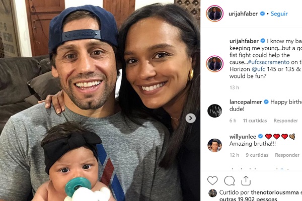 “Eu sei que meu bebê está me mantendo jovem, mas uma boa luta pode ajudar a causa… UFC Sacramento no horizonte. Peso-pena (66 kg) ou galo? E (contra) quem seria divertido?”, questionou.
