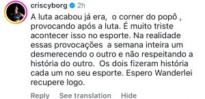 “A luta acabou, já era. O córner do Popó provocando após a luta. É muito triste acontecer isso no esporte. Na realidade, essas provocações a semana inteira, um desmerecendo o outro e não respeitando a história do outro. Os dois fizeram história, cada um no seu esporte. Espero que Wanderlei se recupera logo”, se posicionou Cyborg.