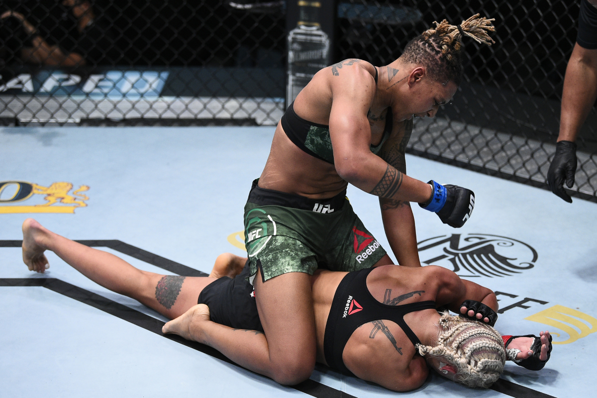 Depois de ser derrubada, Shana não parou de se movimentar por baixo e, aproveitando o cansaço da rival, engatou uma raspagem que a colocou por cima, na montada. E foi ali que a disputa foi definida. Por mais de um minuto, a americana atacou sem parar com golpes no rosto que deixaram Agapova sem condições de continuar na luta.
