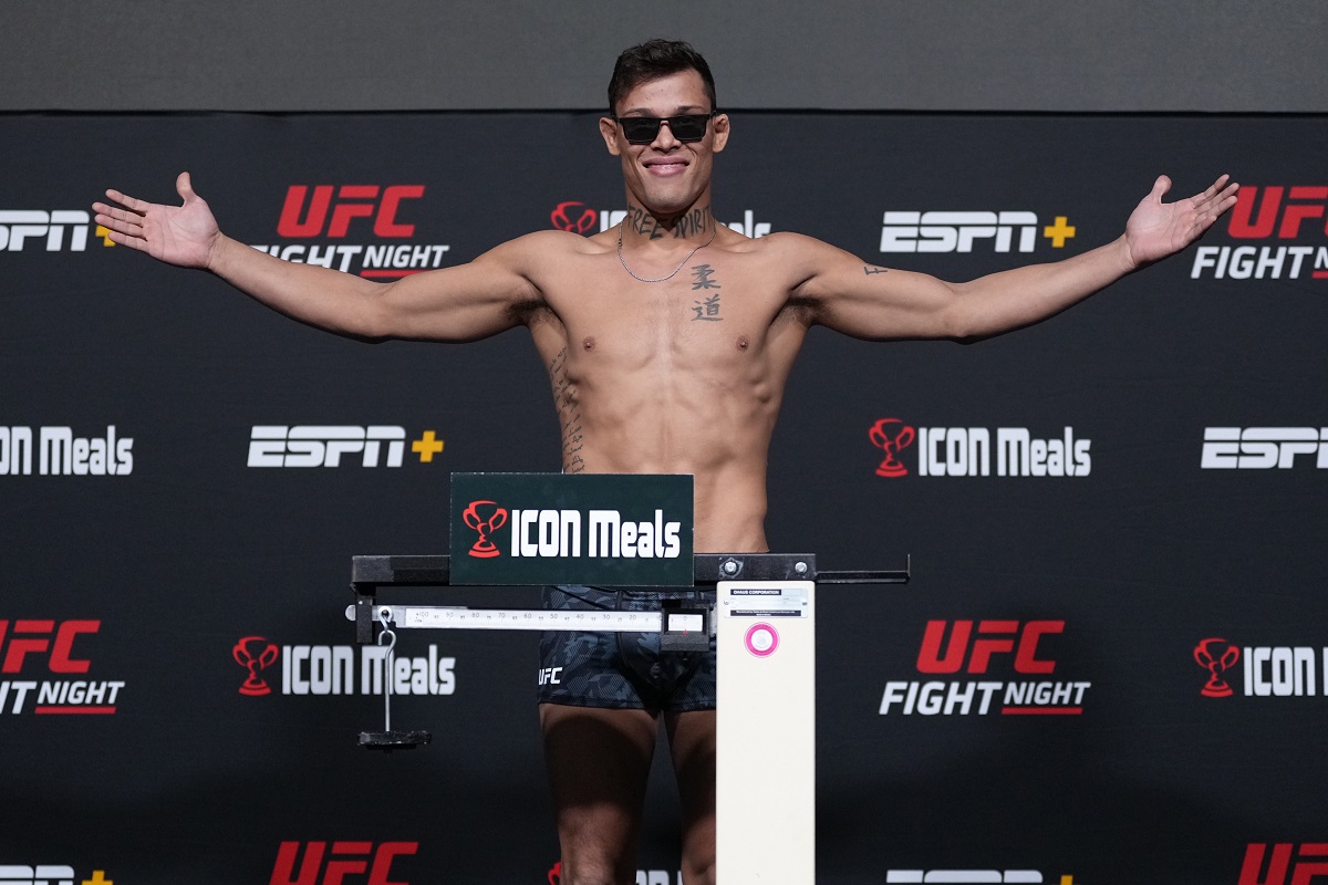 Oriundo do programa ‘Contender Series’, Caio Borralho faz sua estreia no UFC neste sábado, diante do russo Gadzhi Omargadzhiev. Na pesagem realizada nesta sexta-feira (15), em Las Vegas (EUA), o brasileiro e seu oponente cravaram o mesmo peso, 84,3 kg, e garantiram o duelo no card do show. De óculos escuros, o carismático maranhense não deixou o palco sem antes tirar alguns sorrisos dos jornalistas presentes ao replicar a comemoração e o bordão (Receba!) que ganhou fama internacional através dos vídeos publicados na internet pelo ‘Luva de Pedreiro’, personagem criado pelo baiano Iran Ferreira (veja abaixo ou clique aqui).