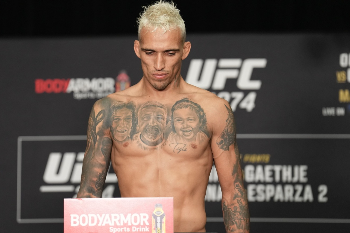 Estrela principal do card do UFC 274, o brasileiro Charles ‘Bronx’ liderou a pesagem oficial realizada nesta sexta-feira (6) na cidade de Phoenix (EUA). Com a marca de 70.5 kg, o campeão dos pesos-leves, último a se pesar, estourou o limite da categoria em pouco mais de 220 gramas. Assim que registrou a marca, o atleta recebeu uma hora extra para atingir o peso exigido.