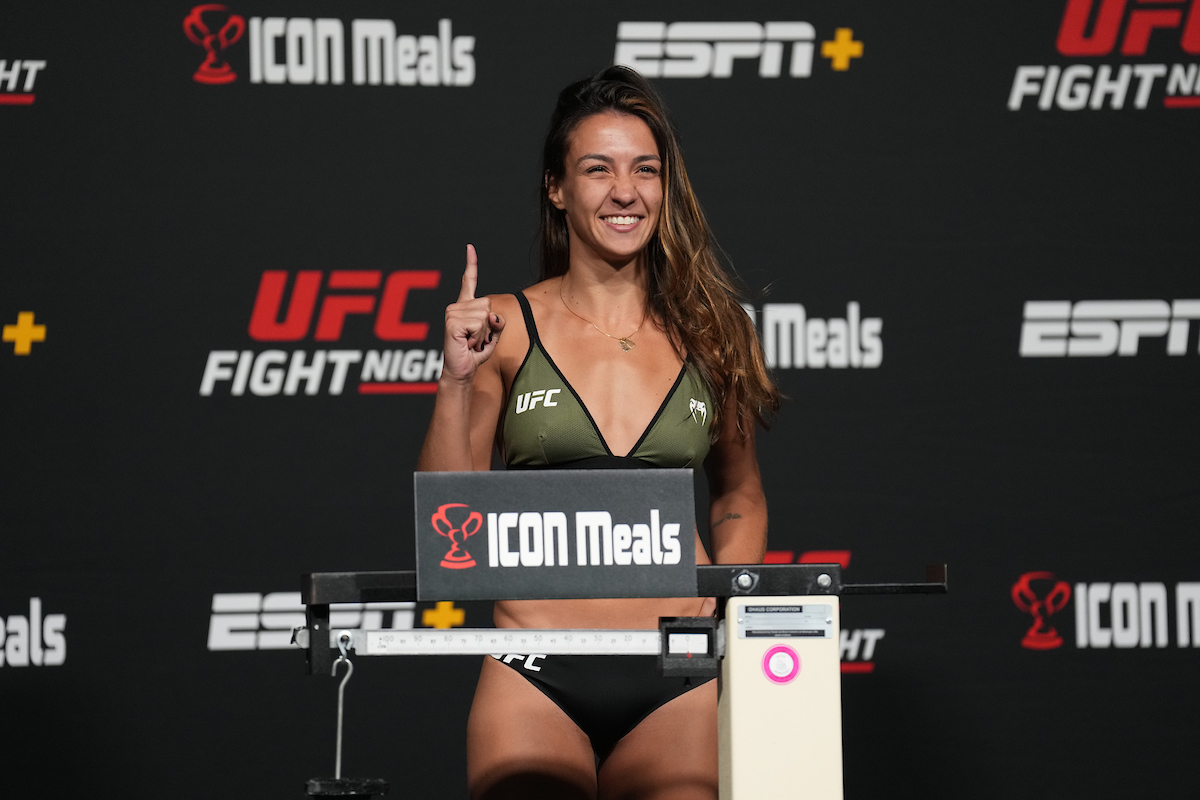 O primeiro representante do Brasil a aparecer na área de pesagem foi Amanda Ribas. A peso-palha (52 kg), que dessa vez vai se aventurar novamente no peso-mosca (57 kg), anotou 56,9 kg e só esperou Katlyn Chookagian para confirmar a luta. Inclusive, a americana ficou com o mesmo peso da promessa do MMA.