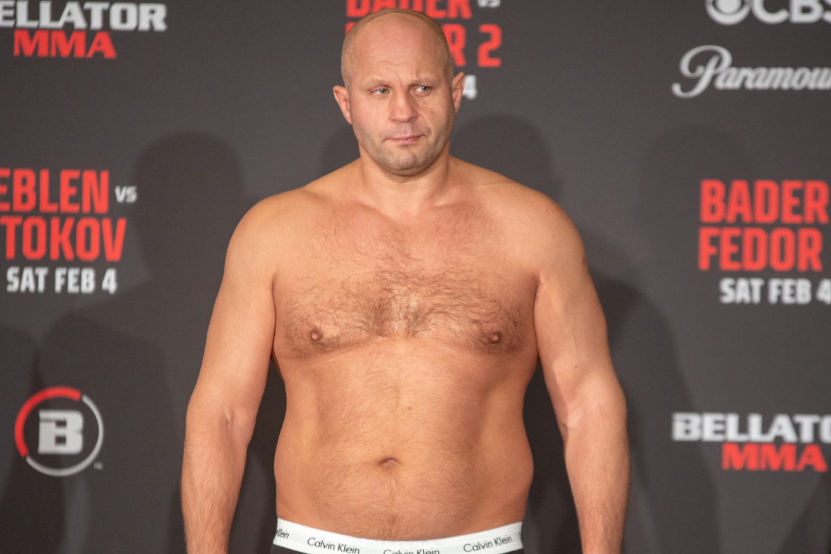 Los Angeles, California - February 3nd: Fedor Emelianenko weighs in at 236.2lb ahead of his Heavyweight Title fight at Bellator 290 Bader vs Fedor 2 at The Forum on February 4th, 2023 in Los Angeles, California, United States. (Photo by Matt Davies)