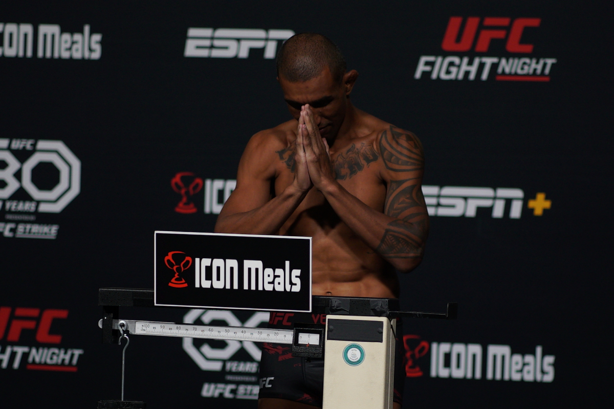 Raoni Barcelos, que viu seu oponente Miles Johns se machucar e ser retirado do card, cumpriu com suas obrigações com a organização e confirmou seu corte de peso. Sorridente, o brasileiro de 36 anos cravou 61.6 kg, o limite exigido na divisão dos pesos-galos. Mesmo sem entrar em ação neste sábado, o carioca se pesou para receber o tradicional ‘show money’ – pagamento concedido pela empresa aos atletas que se dispuseram a competir, de acordo com o contrato.
