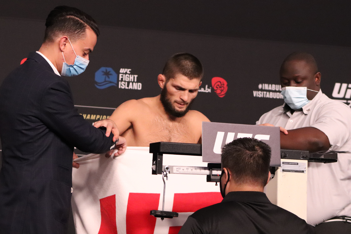 Primeiro a subir na balança na pesagem oficial do UFC 254, realizada na madrugada desta sexta-feira (23), Khabib Nurmagomedov demonstrou visivelmente alívio e, até mesmo, surpresa ao cravar 70,3 kg e bater o limite exigido para disputas de título na divisão dos leves (70 kg). A reação do russo e a rapidez com a qual o fiscal da comissão reguladora do evento confirmou o peso do campeão levantaram suspeitas sobre um possível equívoco cometido no processo.