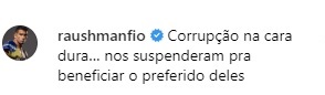 “Corrupção na cara dura. Nos suspenderam para beneficiar o preferido deles”, declarou o brasileiro com seu perfil oficial no ‘Instagram’.