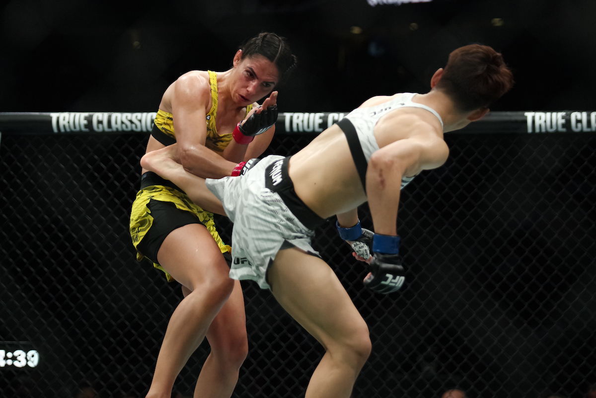 Na segunda parcial, a brasileira tentou mudar o rumo da luta ao buscar uma queda, mas esbarrou na sólida defesa da oponente. Apesar da frustração na tentativa de grappling, ainda teve bons momentos em pé, balançando a rival com dois cruzados de direita. A chinesa, no entanto, manteve o plano de jogo e continuou castigando a perna já bastante comprometida, o que chegou a fazer Ariane cair de dor.