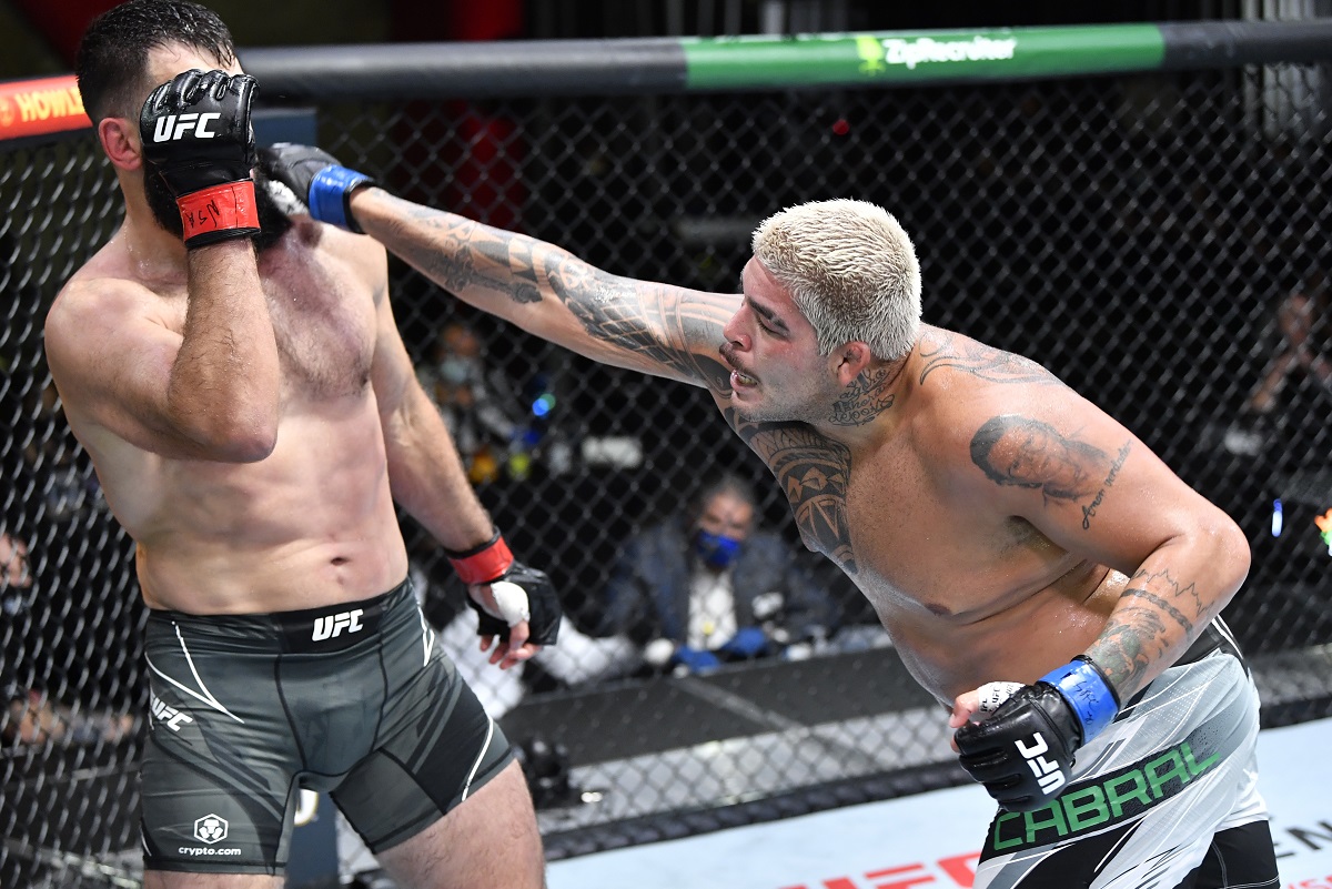 LAS VEGAS, NEVADA - OCTOBER 16: (R-L) Carlos Felipe of Brazil punches Andrei Arlovski of Belarus in a heavyweight fight during the UFC Fight Night event at UFC APEX on October 16, 2021 in Las Vegas, Nevada. (Photo by Chris Unger/Zuffa LLC)