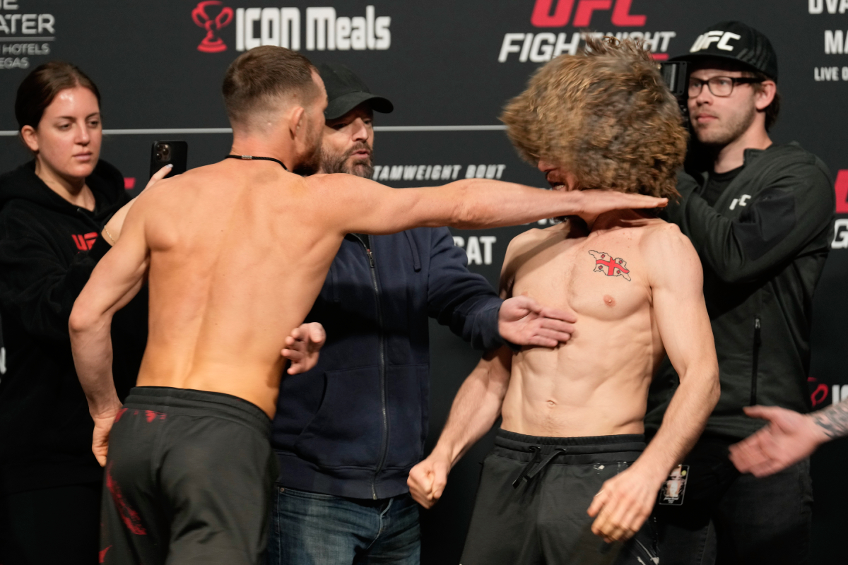 LAS VEGAS, NV - MARCH 10: (L) Petr Yan and Merab Dvalishvili face-off and get into a pushing match following the official weigh-ins at UFC Apex for UFC Fight Night - Vegas 71 - Yan vs Dvalishvili on March 10, 2023 in Las Vegas, NV, United States. (Photo by Louis Grasse/PxImages)