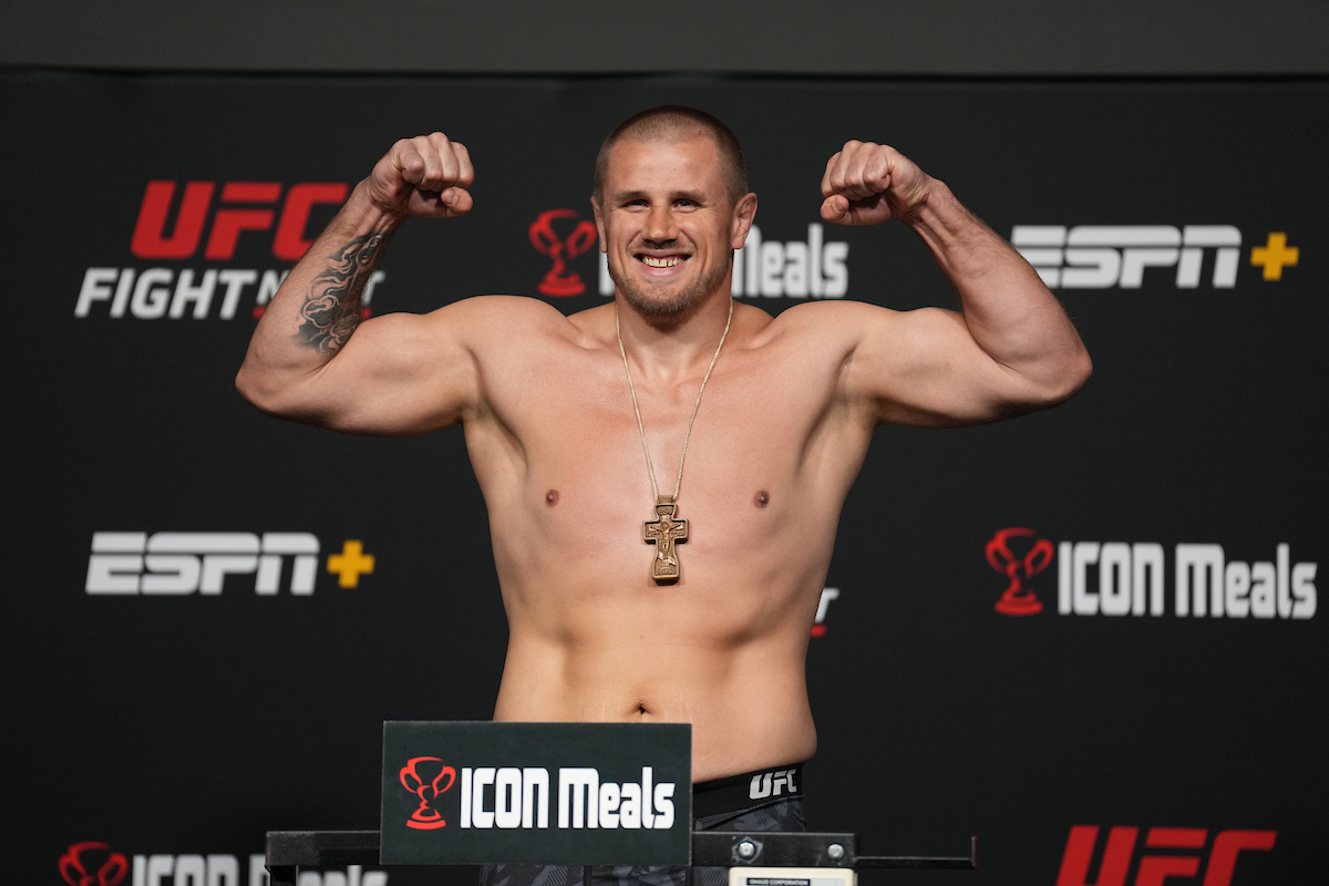 LAS VEGAS, NV - April 29: Alexander Romanov steps on the scale for the official weigh-in at the UFC Apex for UFC Fight Night - Font vs Vera on April 29, 2022 in LAS VEGAS, United States. (Photo by Louis Grasse/PxImages)