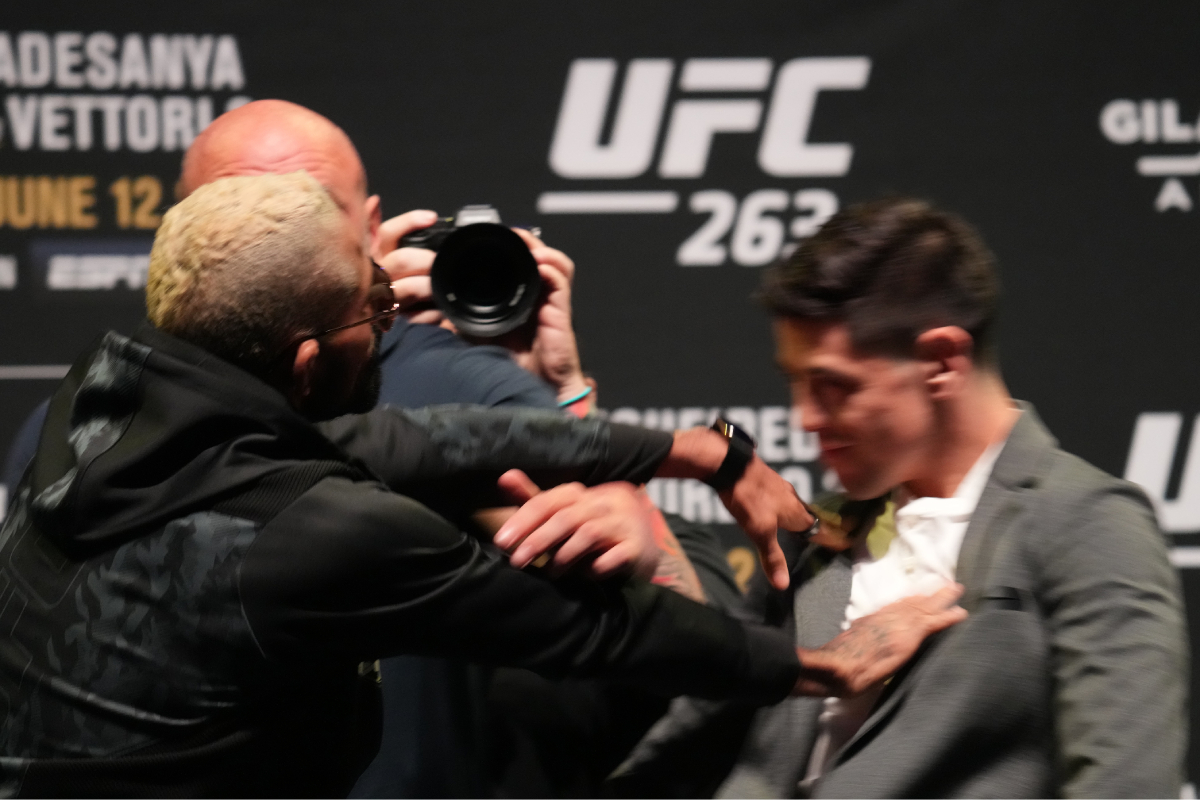 Durante a coletiva de imprensa do UFC 263, realizada na última quinta-feira, Deiveson revelou ter se incomodado com as declarações do rival e afirmou que a disputa havia se tornado pessoal em seu entendimento, prometendo calar nocautear o mexicano no primeiro round, para calá-lo de uma vez por todas. O campeão ainda perdeu a compostura durante as tradicionais encaradas pós-coletiva, empurrando o desafiante, para desespero do presidente da organização, Dana White, que prontamente separou os dois.