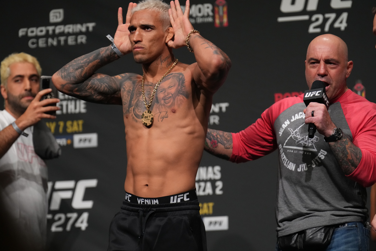 Apesar de não valer o cinturão dos pesos-leves (70 kg) do UFC, Charles Do Bronx confirmou sua participação no card do show deste sábado (7) ao protagonizar tensa encarada com o oponente Justin Gaethje, em Phoenix (EUA). O encontro aconteceu durante a pesagem cerimonial para o evento.