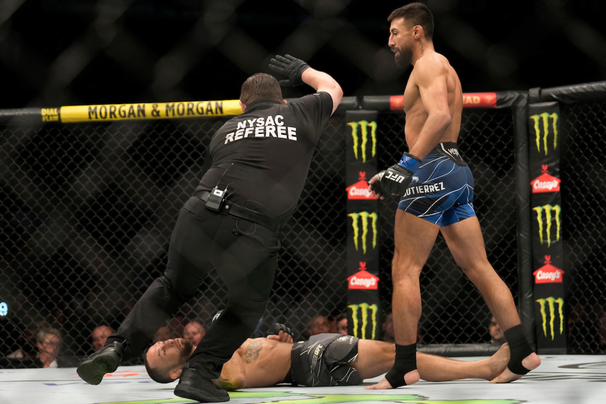 Em risco, Edgar avançou e esperou o momento certo para quedar o oponente. Contudo, na aproximação, o veterano foi surpreendido por Gutiérrez com uma joelhada de encontro e caiu inconsciente. Ao final do duelo, ‘El Guapo’ e sua equipe mostraram ‘fairplay‘ e expressaram admiração e respeito por ‘The Answer‘ que, abalado, confirmou a aposentadoria do MMA.