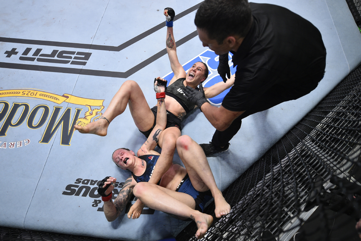 Mesmo por baixo, Maia tentou uma omoplata e depois partiu para uma chave de braço que obrigou Joanne a desistir. Tudo ainda no primeiro round do co-main event da noite.