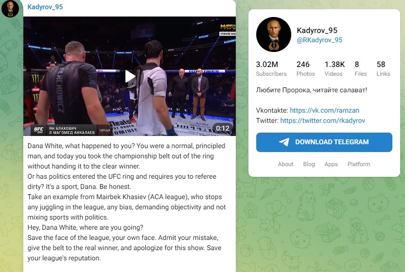 “Dana White, o que aconteceu com você? Você era um homem normal, com princípios, mas você levou o cinturão, sem entregá-lo ao vencedor claro. Ou a política entrou no octógono do UFC e exige que você use arbitragem suja? É um esporte, Dana. Seja honesto. Veja o exemplo de Mairbek Khasiev, no ACA, que impede qualquer malabarismo na liga, algo tendencioso, exigindo objetividade e não misturando esporte com política. Ei, Dana White, onde você está indo? Salve o rosto de sua liga, sua própria cara. Admita seu erro, dê o cinturão para o verdadeiro vencedor e peça desculpas por este show. Salve a reputação da sua liga”, escreveu o político em sua conta oficial no ‘Telegram’.