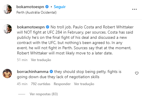 “Eles deveriam parar de serem mesquinhos, a luta vai cair devido à falta de habilidades de negociação deles”, comentou Paulo, em publicação do jornalista Brett Okamoto, da ESPN.