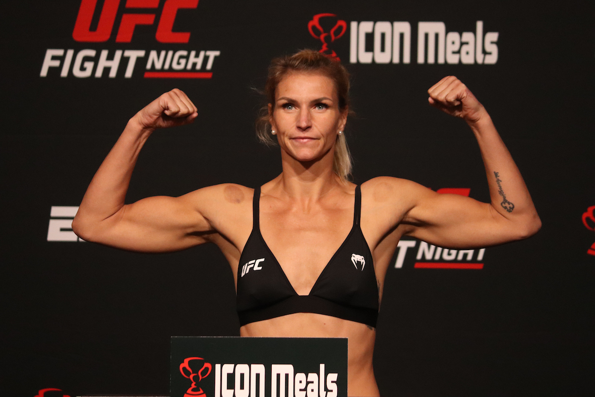LAS VEGAS, NV - OCTOBER 1: Stephanie Egger poses on the scale during the UFC Vegas 38: Santos v Walker Weigh-in at UFC Apex on October 1, 2021 in Las Vegas, Nevada, United States. (Photo by Diego Ribas/PxImages)