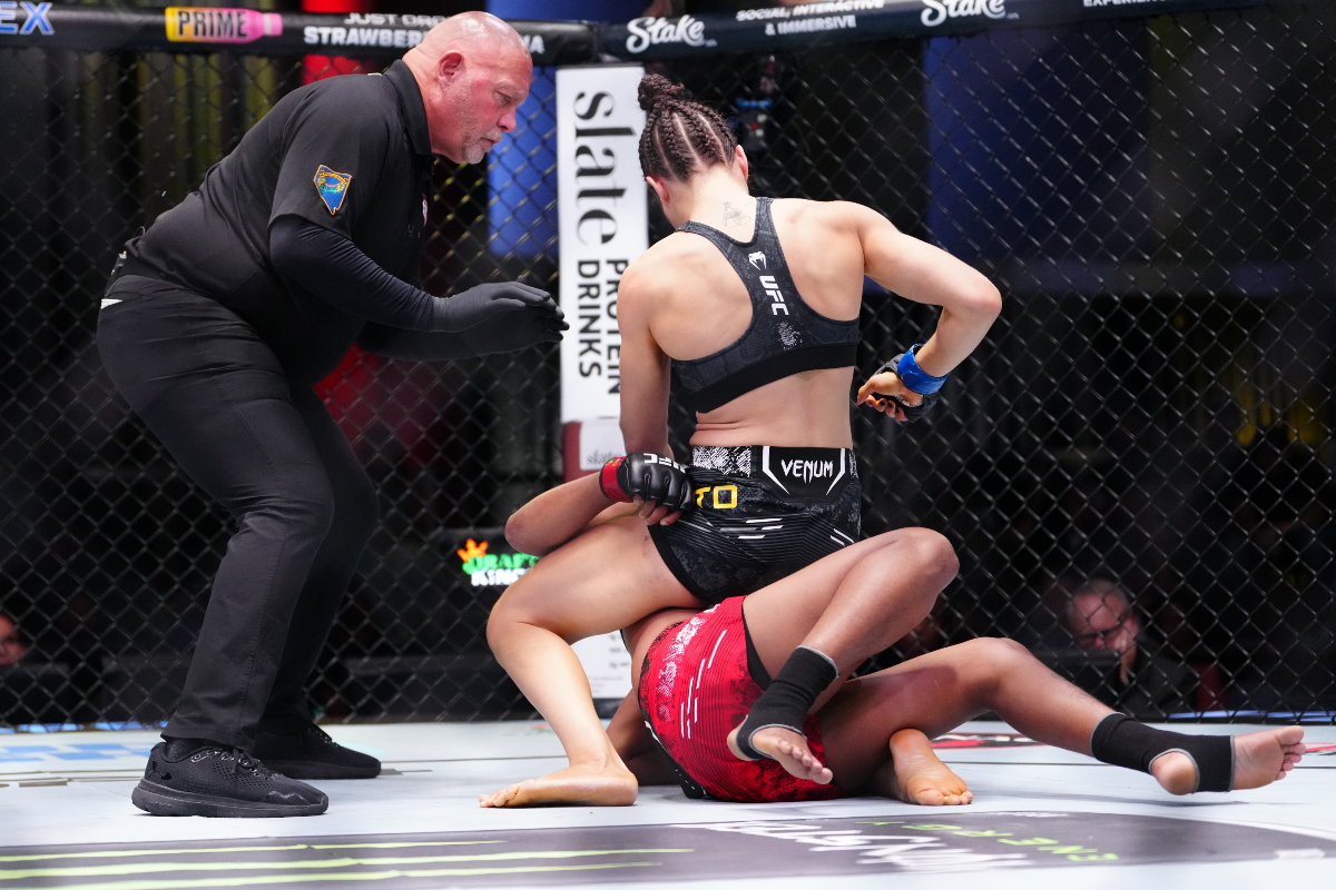 Depois de ver sua última luta ser cancelada durante a realização do evento, Melissa Gatto enfim voltou a competir no octógono mais famoso do mundo. Diante da compatriota Tamires Vidal, a brasileira não deu brechas para a oponente e venceu via nocaute técnico, no terceiro round. O desfecho da luta, porém, foi polêmico, já que a atleta de Campinas (SP) desferiu um soco na região dos seios da adversária antes de liquidar a fatura (veja abaixo ou clique aqui).