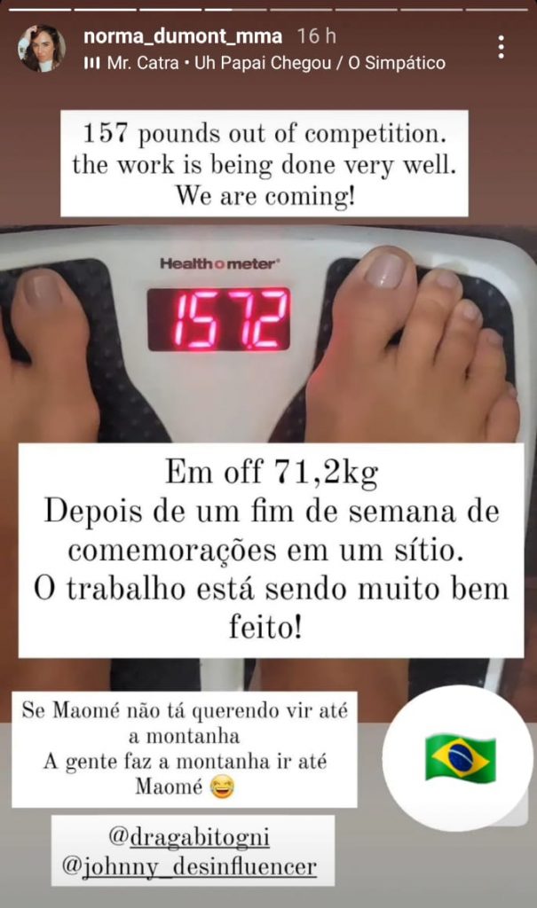 Um deles é o fato de, recentemente, ter alcançado o 13º lugar no ranking dos galos do UFC. Outro importante indicativo ao qual a lutadora mineira se apega é o seu peso atual, fora de competição ou ‘em off’, como os atletas chamam. Também via ‘stories’ do ‘Instagram’ (veja abaixo), Norma revelou que se encontra com 71,2 kg atualmente e que seu corpo tem reagido bem à nova realidade.