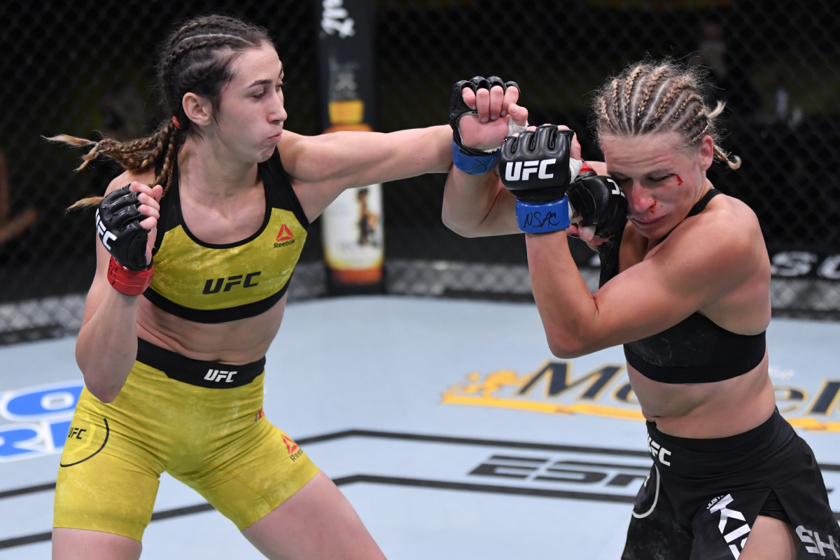 A primeira luta da noite do UFC Las Vegas 10 contou com uma apresentação de gala em duelo realizado praticamente todoe em pé. A promissora atleta da Colômbia Sabina Mazo, de apenas 23 anos, deu show de garra e técnica diante da ex-campeã mundial de muay thai Justine Kish para vencer com uma finalização pela primeira vez em sua carreira.