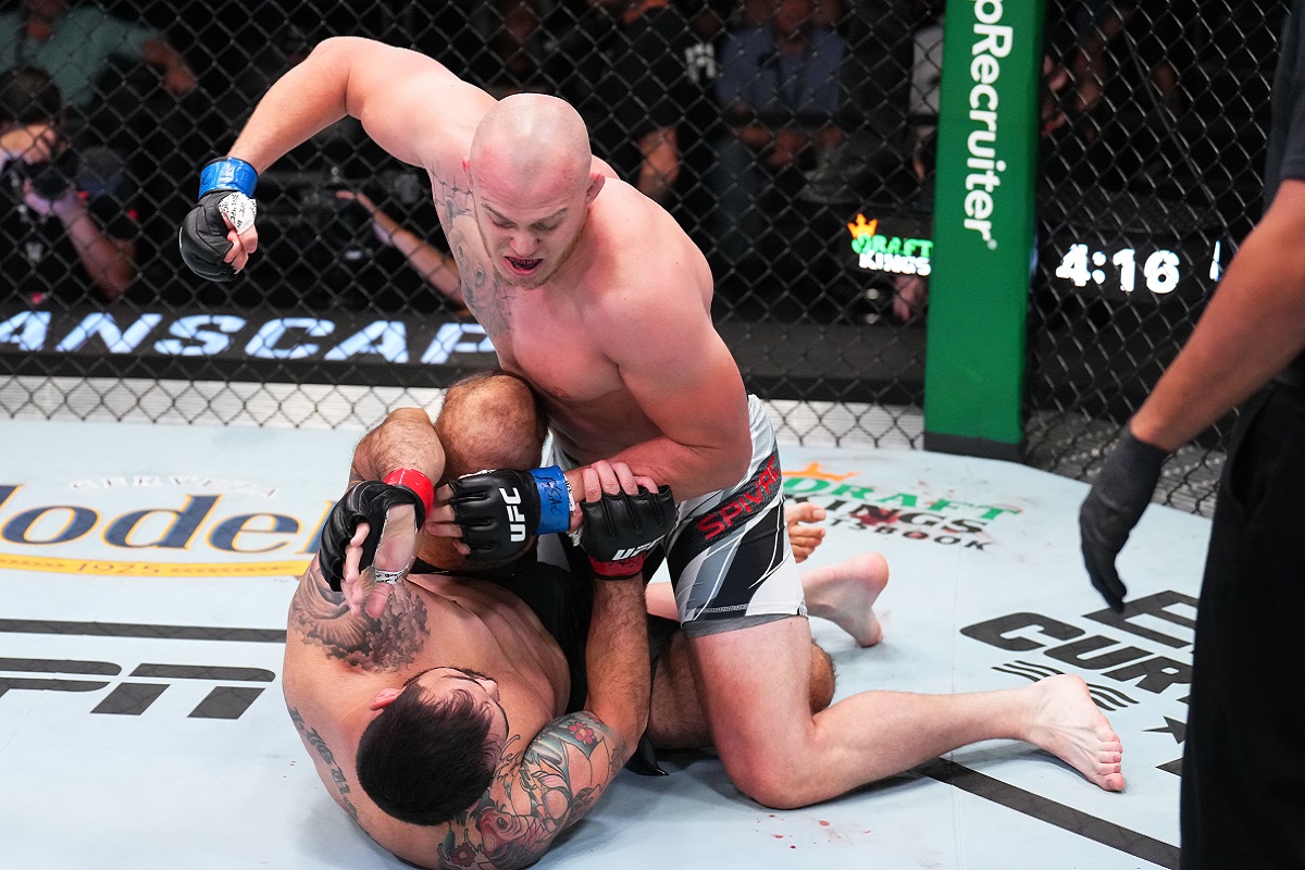 LAS VEGAS, NEVADA - AUGUST 06: (R-L) Serghei Spivac of Moldova punches Augusto Sakai of Brazil in a heavyweight fight during the UFC Fight Night event at UFC APEX on August 06, 2022 in Las Vegas, Nevada. (Photo by Chris Unger/Zuffa LLC)