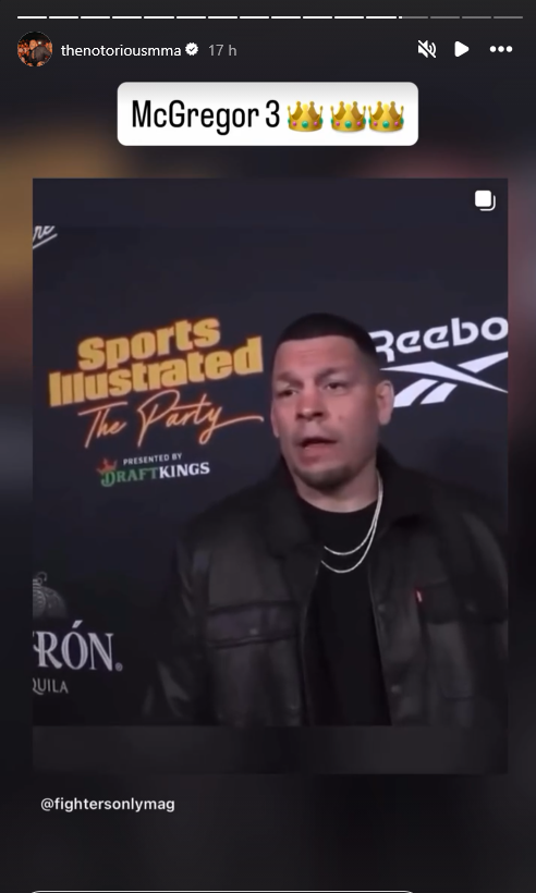 Em seu ‘Instagram’, por meio da ferramenta ‘Stories’, o ex-campeão peso-pena (66 kg) e peso-leve (70 kg) compartilhou o vídeo em que é mencionado pelo rival e acrescentou a legenda “McGregor 3”, acompanhada de três coroas. A postagem foi interpretada como um indicativo claro de que o astro europeu vê com bons olhos a possibilidade de voltar a dividir o octógono com o antigo desafeto.