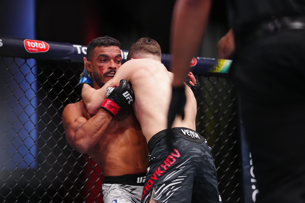 Depois de acompanhar a vitória do irmão mais novo, Gabriel, no card preliminar do UFC Vegas 102, neste sábado (15), Ismael Bonfim não foi capaz de repetir o resultado positivo do mais jovem da família. O peso-leve (70 kg) de Brasília (DF) acabou derrotado por Nazim Sadykhov, por nocaute técnico, após interrupção médica.